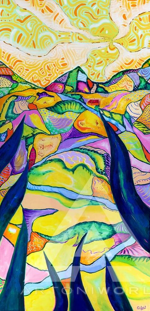 This vibrant oil painting is inspired by my experiences in the Republic of Panama. It radiates an energetic and psychedelic aura, with a swirling tapestry of colors that blend and contrast in a dynamic flow. The composition is vertical, drawing the eye upwards from the dark, pointed shapes at the bottom, reminiscent of sharp, elongated leaves like abstract flames reaching skyward. These dark blue and black spikes frame the lower portion of the piece, giving a grounding contrast to the bright, vivid hues above.