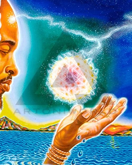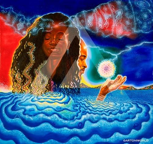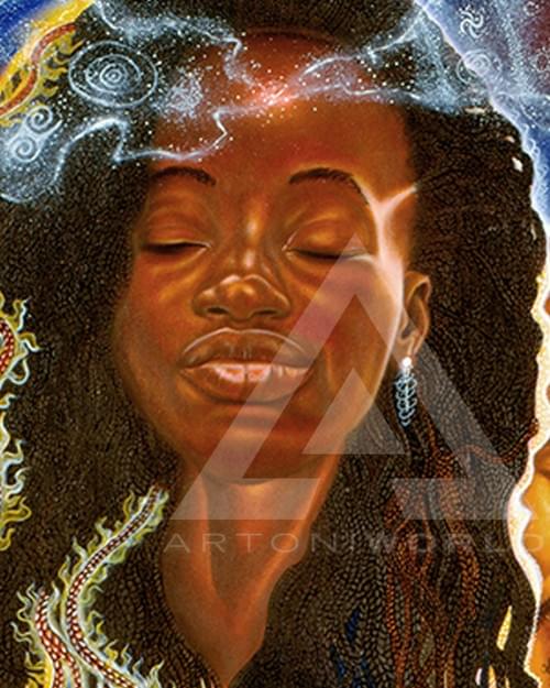 This vibrant and deeply evocative image melds the human form with elements of nature and cosmic wonder, creating a surreal and meditative scene. At the forefront is a serene woman with flowing dark hair that seems to blend into the waves of the ocean below her, as if she is both emerging from and part of the sea. Her eyes are closed, symbolizing introspection, calm, or a deep connection to the inner self or the universe.