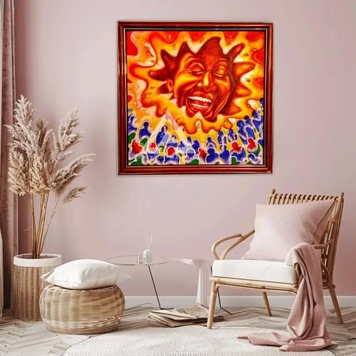 This oil painting bursts with vivid colors and profound emotional energy. The dominant feature is a colossal sun as the face of my Mother, animated with a broad, infectious laughter that instantly conveys warmth and joy. Her face is rendered in bright oranges and reds, radiating a lively energy that feels almost tangible. Her eyes are closed in bliss, and the curled lips and visible teeth suggest a hearty, genuine laugh.