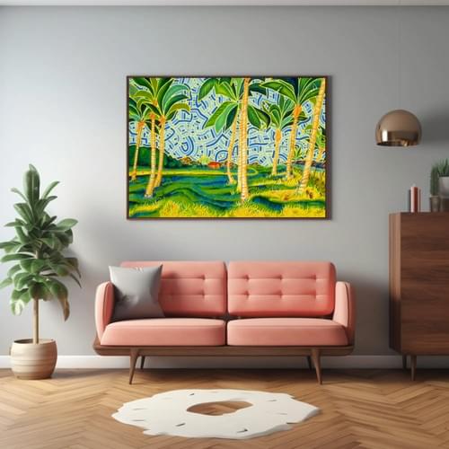 This oil painting is a vibrant and imaginative landscape combining elements of nature with abstract patterns. At the forefront, tall palm trees stand prominently, their textured trunks and lush green fronds reaching upwards. The way the light falls creates dynamic shadows and varying hues of green on the grass and foliage, lending a sense of depth and warmth.