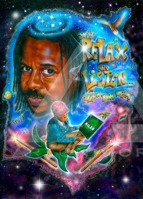 Below and to one side, a smaller, childlike figure sits cross-legged on a blossoming lotus or crystalline flower, holding the cover of a Miles Davis LP. Energetic ribbons of color — neon pinks, electric blues, and glowing greens — spiral out from the cover, suggesting that whatever the figure hears - it is birthing thoughts, visions, constellations and sparkles. The LP cover itself catches the eye & radiates as if holding a private universe.