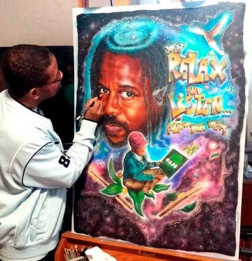 A luminous, dreamlike scene unfolds against a velvet field of stars and nebulae. Dominating the composition is a large, portrait of the great Wilby Fletcher, Jr. whose gaze is steady and thoughtful; his face is rendered with warm, painterly detail and framed by long, textured dreads. Light seems to pool around his features, giving them a molten, almost sculpted quality that blends into the surrounding cosmic glow.